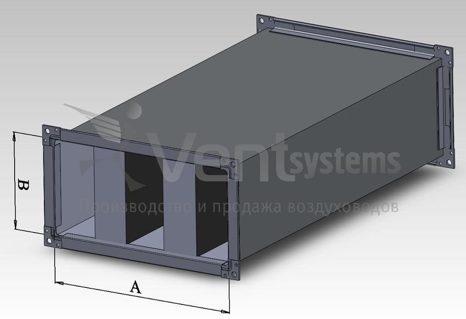 - Шумоглушители для круглых воздуховодов представляют собой прямоугольный короб, с помещенными внутрь пластинами с звугопоглощающим материалом. Расстояние между пластинами может быть разным. Чем меньше размер ячеек, тем ниже уровень звука, однако, при этом повышаются потери давления воздуха.