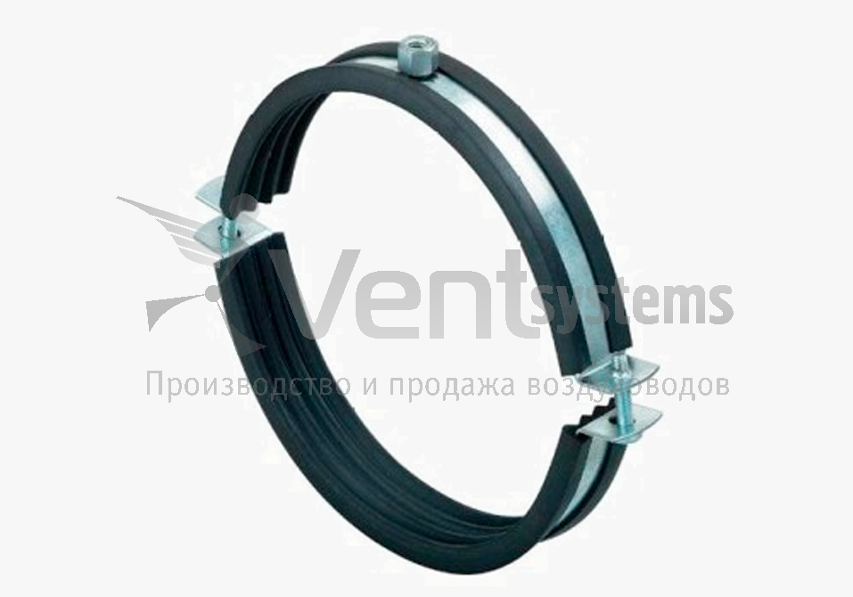 Конструкция хомута состоит из двух полуколец, которые стягиваются друг с другом винтами. Удобная конструкция изделия позволяет устанавливать их на воздуховоды быстро и без труда. Крепление хомута к поверхности осуществляется с помощью резьбовой шпильки или анкера. В некоторых случаях возможно одновременное использование хомута и перфоленты.