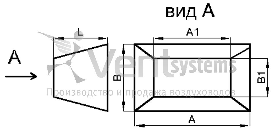 Данный переход стыкует прямоугольные воздуховоды разного размера. Смещение является центральным.
