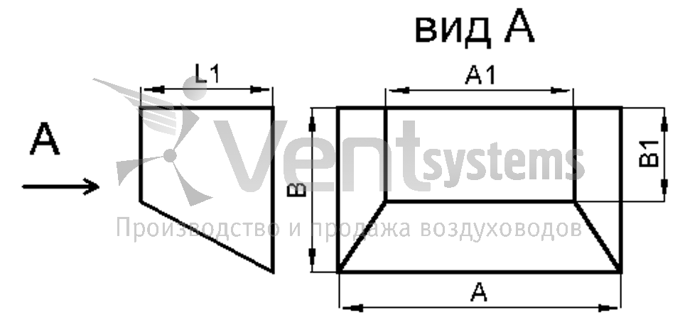 Данный переход стыкует прямоугольные воздуховоды разного размера. Смещение является односторонним по стороне B.